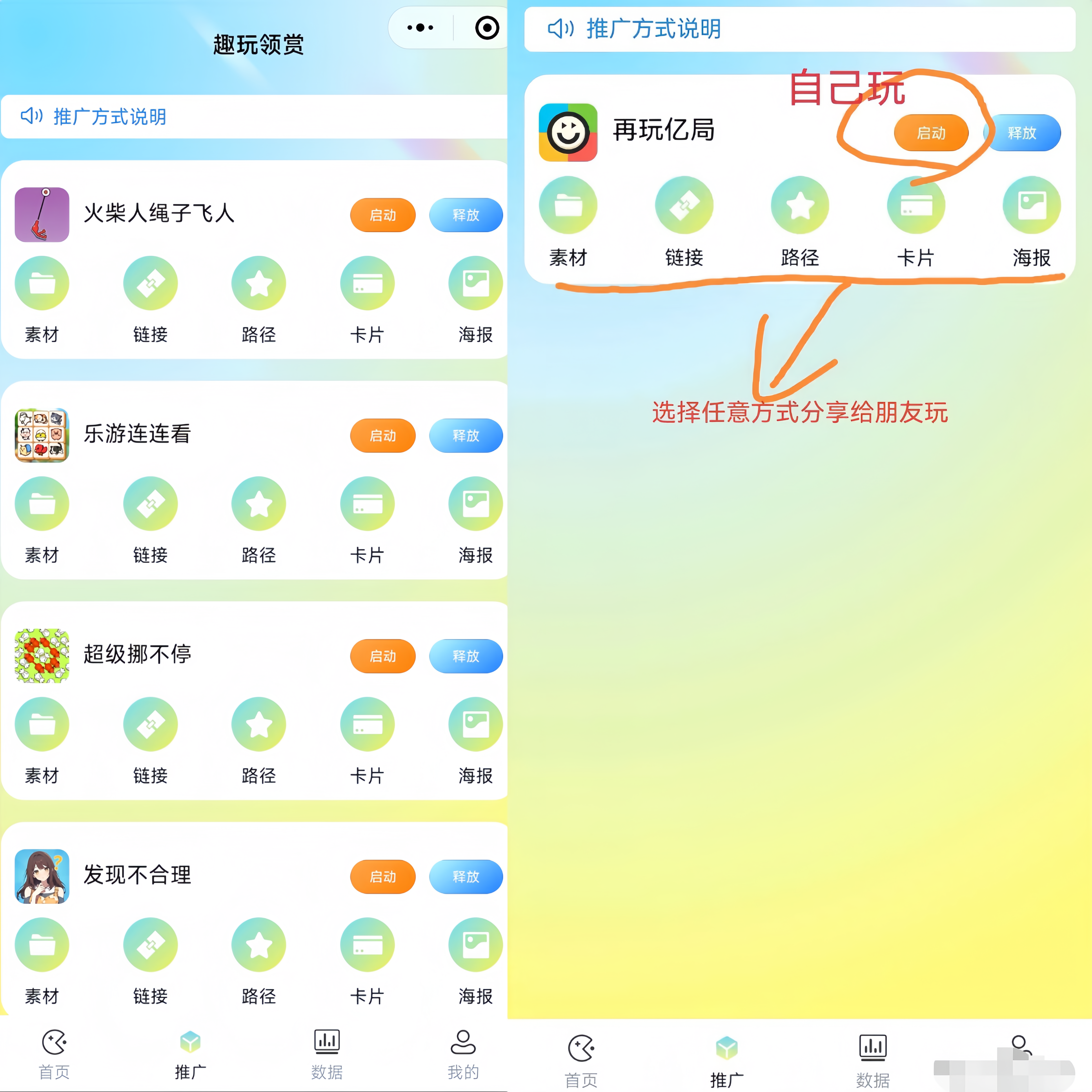 申请完了以后去推广页,点击 “ 启动 ” 就可以自己玩了!